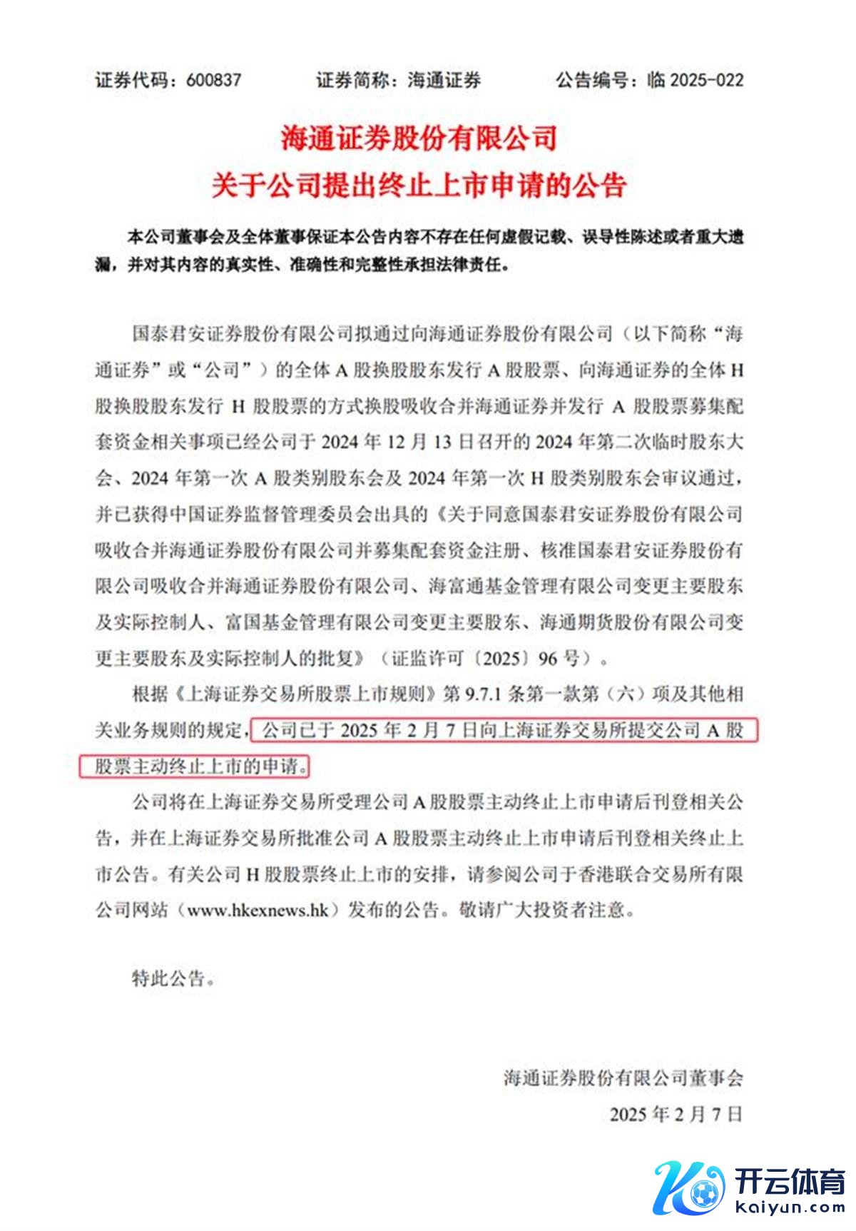 2025年2月7日,海通证券朝上海证券走动所提交公司A股股票主动休止上市的苦求。