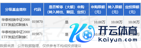 本站音信,2月22日华泰柏瑞基金措置有限公司发布《华泰柏瑞中证2000往复型洞开式指数证券投资基金发起式王人集基金诊疗大额申购(含转机转入、如期定额投资)业务的公告》。公告中领导,为保证本基金的踏实运作,保护基金份额握有东谈主利益,以及阐述《华泰柏瑞中证2000往复型洞开式指数证券投资基金发起式王人集基金基金公约》的继续规章,自2025年2月24日起华泰柏瑞中证2000往复型洞开式指数证券投资基金发起式王人集基金诊疗大额申购(含转机转入、如期定额投资)业务,申购、转机转入上限金额为10.0万元,下属分级基金诊疗明细如下: